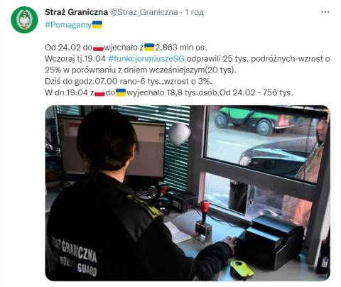 Станом на 8 квітня до Польщі прибули майже 2,573 мільйона біженців з України, натомість станом на 18 квітня, починаючи з 24 лютого в Україну з-за кордону повернулися 1 мільйон 60 тисяч українців.