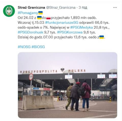 Станом на сьогодні на ранок, починаючи із 24 лютого, початку широкомасштабної війни Росії проти України, до Польщі з України прибуло 1,893 мільйона біженців.