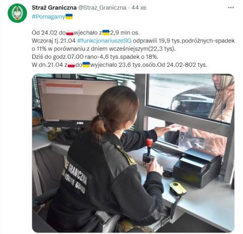 Станом на 8 квітня до Польщі прибули майже 2,573 мільйона біженців з України, натомість станом на 18 квітня, починаючи з 24 лютого в Україну з-за кордону повернулися 1 мільйон 60 тисяч українців.