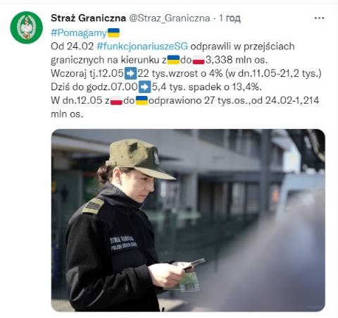 Станом на сьогодні на ранок, починаючи із 24 лютого, початку широкомасштабної війни Росії проти України, до Польщі з України прибуло 3,338 мільйона біженців.