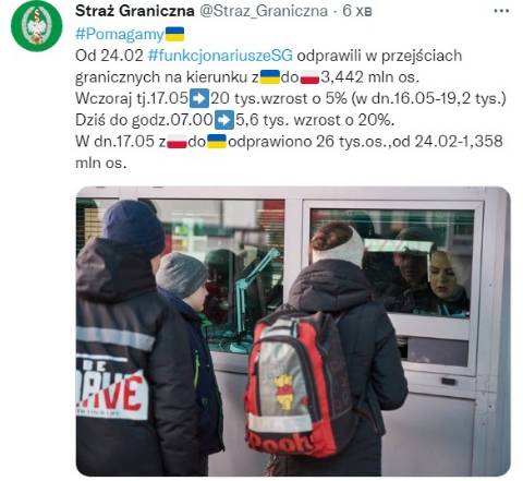 Станом на сьогодні на ранок, починаючи із 24 лютого, початку широкомасштабної війни Росії проти України, до Польщі з України прибуло 3,442 мільйона біженців.