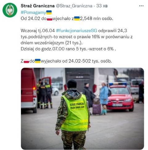 Станом на сьогодні на ранок, починаючи із 24 лютого, початку широкомасштабної війни Росії проти України, до Польщі з України прибуло 2,548 мільйона біженців.