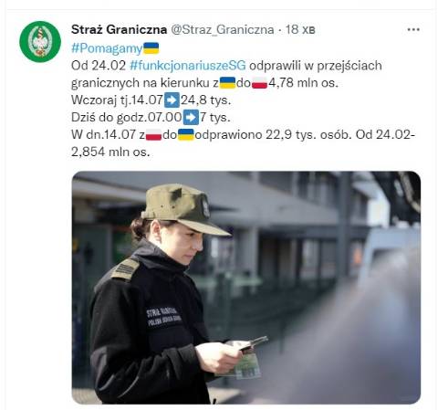 Станом на сьогодні на ранок, починаючи із 24 лютого, початку широкомасштабної війни Росії проти України, до Польщі з України прибуло 4,78 мільйона біженців.