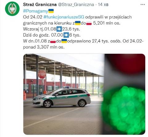 Станом на сьогодні на ранок, починаючи із 24 лютого, початку широкомасштабної війни Росії проти України, до Польщі з України прибуло 5,201 мільйона біженців.