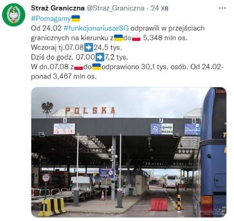 Станом на сьогодні на ранок, починаючи із 24 лютого, початку широкомасштабної війни Росії проти України, до Польщі з України прибуло 5,348 мільйона біженців.