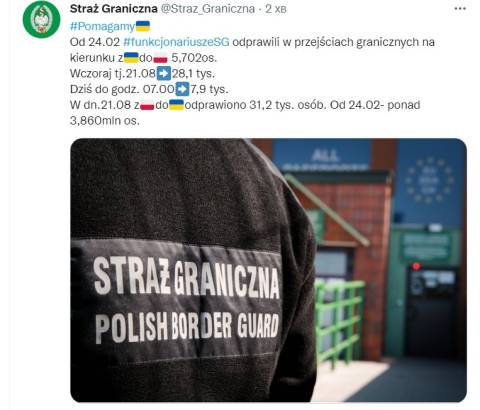 Станом на 26 липня до Польщі прибули понад 5 мільйонів біженців з України, натомість станом на 18 квітня, починаючи з 24 лютого в Україну з-за кордону повернулися 1 мільйон 60 тисяч українців.