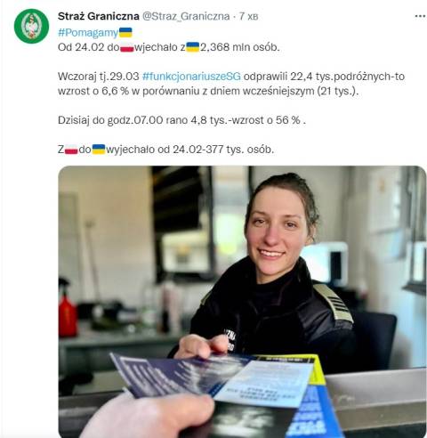 Станом на сьогодні на ранок, починаючи із 24 лютого, початку широкомасштабної війни Росії проти України, до Польщі з України прибуло 2,368 мільйона біженців.