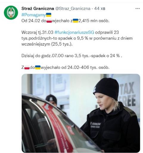 Лише за вчора, 31 березня, українсько-польський кордон перетнули 23 тисячі українців, що на 9,5% менше, ніж попереднього дня (25,5 тисячі осіб).
