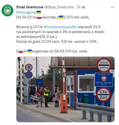 Станом на сьогодні на ранок, починаючи із 24 лютого, початку широкомасштабної війни Росії проти України, до Польщі з України прибуло 2,573 мільйона біженців.