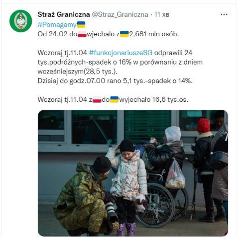 Станом на сьогодні на ранок, починаючи із 24 лютого, початку широкомасштабної війни Росії проти України, до Польщі з України прибуло 2,681 мільйона біженців.