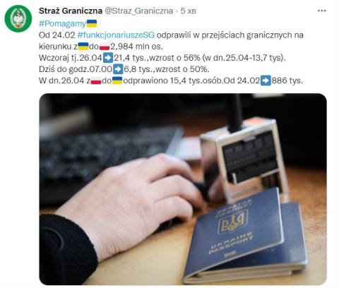 Станом на 25 квітня до Польщі прибули майже 2,96 мільйона біженців з України, натомість станом на 18 квітня, починаючи з 24 лютого в Україну з-за кордону повернулися 1 мільйон 60 тисяч українців.