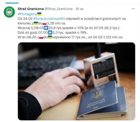 Лише за вчора, 8 травня, українсько-польський кордон перетнули 23,6 тисяч українців, що на 10% менше, ніж попереднього дня 26,3 тисячі осіб).