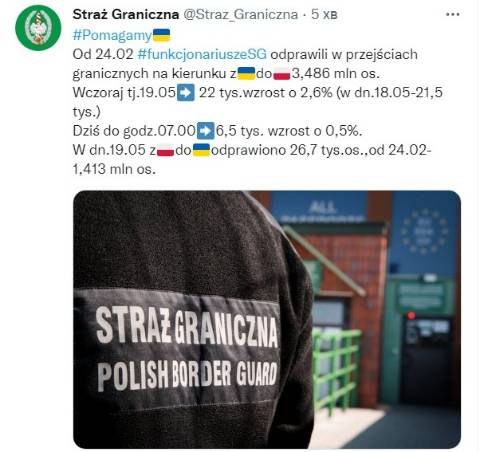 Станом на сьогодні на ранок, починаючи із 24 лютого, початку широкомасштабної війни Росії проти України, до Польщі з України прибуло 3,484 мільйона біженців.