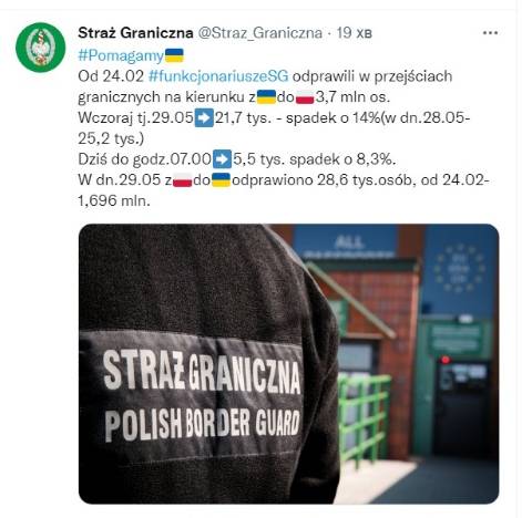 Станом на 22 травня до Польщі прибули 3,5 мільйони біженців з України, натомість станом на 18 квітня, починаючи з 24 лютого в Україну з-за кордону повернулися 1 мільйон 60 тисяч українців.