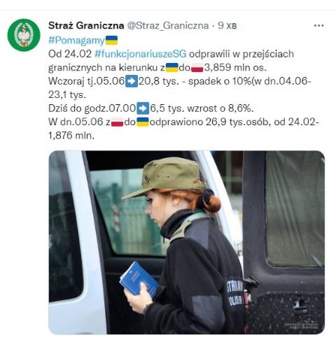 Станом на 22 травня до Польщі прибули 3,5 мільйони біженців з України, натомість станом на 18 квітня, починаючи з 24 лютого в Україну з-за кордону повернулися 1 мільйон 60 тисяч українців.