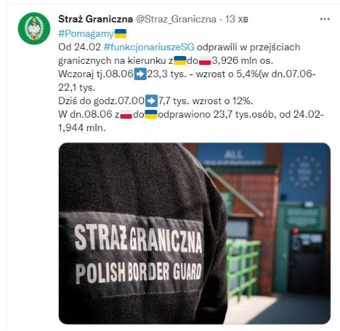 Станом на сьогодні на ранок, починаючи із 24 лютого, початку широкомасштабної війни Росії проти України, до Польщі з України прибуло 3,926 мільйона біженців.