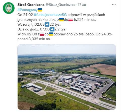 Також вчора з Польщі до України прибули 25 тисяч осіб, а за весь час війни – 3,332 мільйона осіб.
