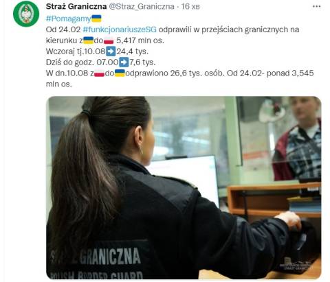 Станом на сьогодні на ранок, починаючи із 24 лютого, початку широкомасштабної війни Росії проти України, до Польщі з України прибуло 5,417 мільйона біженців.