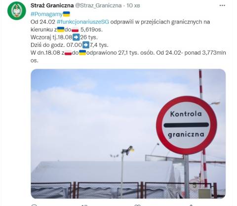 Станом на сьогодні на ранок, починаючи із 24 лютого, початку широкомасштабної війни Росії проти України, до Польщі з України прибуло 5,619 мільйона біженців.