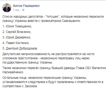 "Депутатська недоторканість не поширюється на чисто кримінальний злочин – незаконне переправлення осіб через державний кордон України", – наголосив Антон Геращенко.