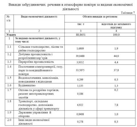 Атмосферу області забруднюють підприємства із добувної промисловості та розроблення кар’єрів – 39,0488 тисяч тонн за рік, а також підприємства із постачання електроенергії, газу, пари та кондиційованого повітря – 33,5875 тисяч тонн за рік.