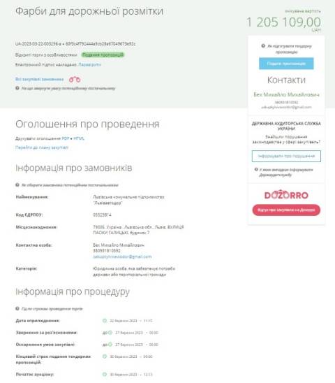 Львівське комунальне підприємство "Львівавтодор" оголосило тендер у системі ProZorro на придбання фарби для дорожньої розмітки, які переможець тендеру має поставити до 31 грудня 2023 року.