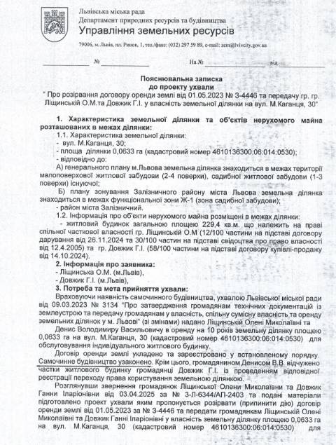 Згідно з документом, йдеться про ділянку площею 0,0633 га, що знаходиться на вул. М. Каганця, 30 у Залізничному районі Львова й перебуває у комунальній власності. Тут розташований житловий будинок площею 229,4 м², що станом на сьогодні перебуває у спільній власності Олени Ліщинської (частина будинку з 2005 року, ще інша частина будинку – з листопада 2024 року) та Ганни Довжик (з жовтня 2024 року).