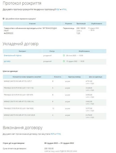 Договір уклали з ТзОВ "ЗР Технолоджі груп" на запропоновану РВА суму у 200 100 грн. Згідно з ним, вартість однієї шини коливалася від 3 377 грн до 6 276 грн, в залежності від різновиду продукції.
