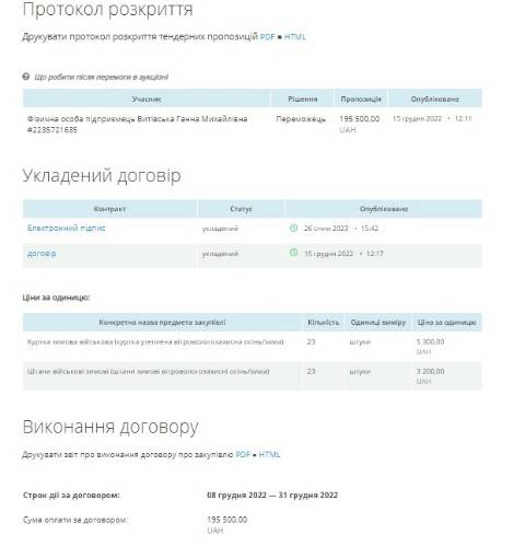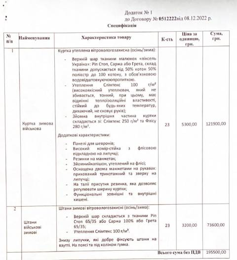 Договір на постачання цієї продукції Дрогобицька РВА уклала з підприємницею Ганною Витівською на запропоновану РВА суму у 195 500 грн. Згідно з договором, вартість однієї куртки становила 5 300 грн, а штанів – 3 200 грн.