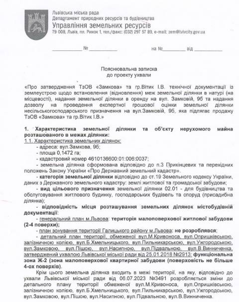 На сайті Львівської міськради оприлюднили проєкт ухвали про затвердження ТзОВ "Замкова" та Ірині Вітик технічної документації із землеустрою, надання земельної ділянки в оренду на вул. Замковій, 9-Б та надання дозволу на проведення експертної грошової оцінки цієї земельної ділянки, що підлягає продажу ТзОВ "Замкова" та Ірині Вітик.