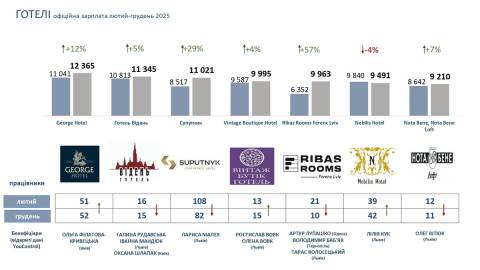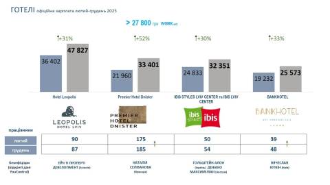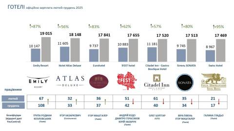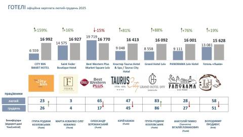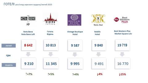 Найбільше зросли середні зарплати у готелях: City Inn Smart Hotel – 16 992 грн (у лютому – 6 559 грн), Swiss Hotel – 17 469 грн (у лютому – 8 967 грн), Grand Hotel Lviv – 16 092 грн (у лютому – 8 558 грн), Emily Resort – 19 015 грн (у лютому – 10 147 грн), Eurohotel – 17 841 грн (у лютому – 9 737 грн), Taurus Hotel & Spa/Taurus City Hotel – 16 413 грн (у лютому – 9 048 грн), Sonata – 17 513 грн (у лютому – 9 745 грн).