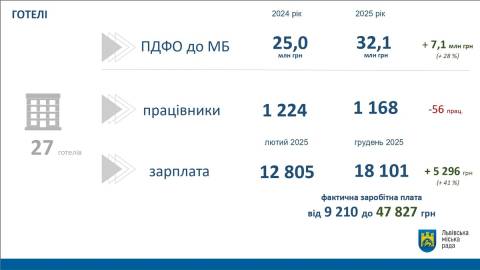 Зокрема, за даними міськради, ПДФО від готелів зріс із 25 млн грн у 2024 році до 32,1 млн грн у 2025 році, що на 28% більше. Водночас кількість працівників у готелях зменшилася – з 1224 до 1168 осіб.
