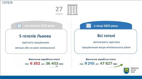 Найвищі середні зарплати зафіксували у готелях: Leopolis Hotel – 47 827 грн (у лютому 2025 року – 36 402 грн), Premier Hotel Dnister – 33 401 грн (у лютому – 21 960 грн), Ibis/Ibis Styles – 32 351 грн (у лютому – 24 833 грн), Bankhotel – 25 573 грн (у лютому – 19 232 грн)