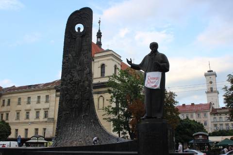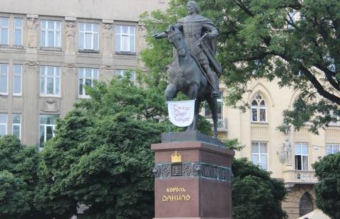 Полотнища розміром приблизно 1,5×1 м висять на пам'ятниках королю Данилу Галицькому та Тарасу Шевченку. Наразі невідомо хто і коли їх повісив.