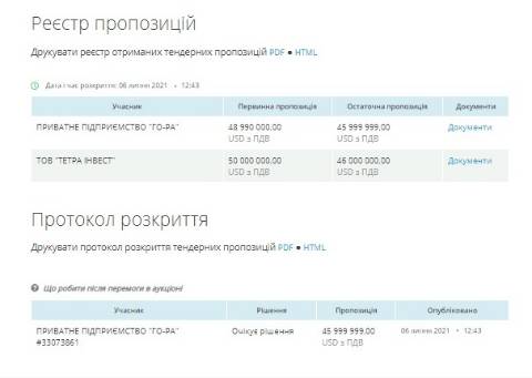 Натомість на аукціон щодо договору оренди з можливістю викупу подалися дві фірми: ПП "ГО-РА" та ТОВ "Тетра Інвест", а вартість будівництва центру вони оцінили у 45 999 999 грн і 46 000 000 грн відповідно. Переможцем торгів Укрпошта обрала фірму із найдешевшою пропозицією – ПП "ГО-РА".