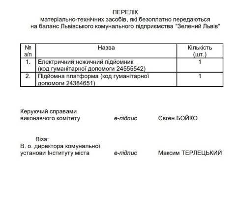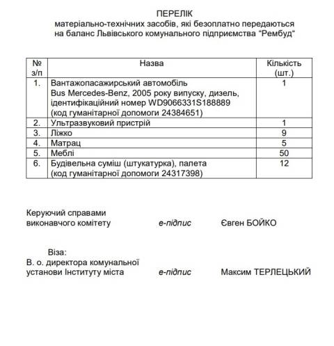 Йдеться про електричний ножичний підйомник та підйомну платформу, які мають передати для ЛКП "Зелений Львів", а також вантажопасажирське авто Bus Mercedes-Benz, 2005 року випуску, ультразвуковий пристрій, дев'ять ліжок, п'ять матраців, 50 меблів та 12 одиниць будівельної суміші для ЛКП "Рембуд".