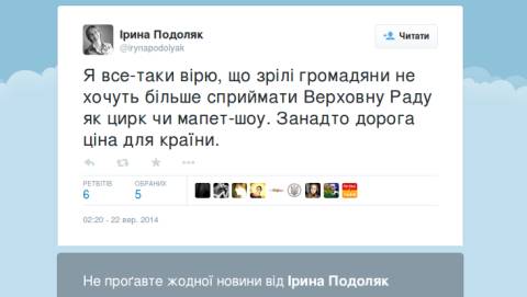 Ще 22 вересня 2014 року у твіттері громадянки Подоляк надрукувалась ось така верлібра: "Я все-таки вірю, що зрілі громадяни не хочуть більше сприймати Верховну Раду як цирк чи мапет-шоу. Занадто дорога ціна для країни". Порівняння української політики з цирком – це вже, звичайно, дика банальність у світі дикої української реальності, але з The Muppet Show у Подоляк – це вже, звичайно, трохи не тойво, оскільки жодне скликання Верховної Ради за усі роки Незалежності так і не дотягнулось своїми паяцними потугами до геніальності деяких скетчів Джима Генсона. Так Подоляк порушила святу заповідь будь-якого політика – заповідь "фільтруй базар".