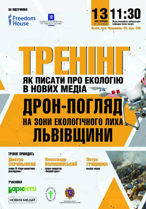 Експерти проекту "Дрон-погляд на зони екологічного лиха Львівщини" 13 листопада, у п'ятницю, у Львові проведуть тренінг для журналістів і студентів про те, як проводити журналістські розслідування.