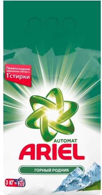 Ariel давно зарекомендував себе на ринку як порошок, з яким немає необхідності прати двічі. Завдяки спеціальним полімерам, які ефективно видаляють різні плями, а також розгладжують бавовняні волокна, білизна чудово відпирається вже з першого разу і зберігає свою білизну.