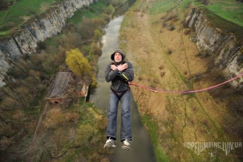 Окрім того, ми співпрацюємо з людьми із Дніпропетровська. Там є команда, яка стрибає у Криму зі скелі Шаан-Кая, що має 230 метрів. Наразі це найвищий об’єкт для стрибків з роуп-джампінгу у всьому СНД. У такому стрибку людина летить між скелями у вільному падіння аж 8 секунд.