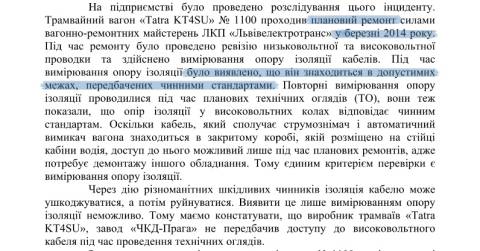ЛКП "Львівелектротранс" провело службове розслідування інциденту. За матеріалами, які були надані відділом зв'язків з громадськістю, вдалося з'ясувати, що ревізія проводки, несправність якої і стала причиною короткого замикання у трамвайному вагоні, здійснюється лише під час планових технічних оглядів та ремонтів. Останній раз такий ремонт проведили у березні 2014 року, тобто за 1,5 роки до аварії.