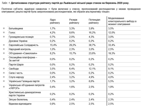 Рейтинг Європейської Солідарності, порівняно з лютим, зріс з 27,3% до 33,4%, Самопомочі – з 16,9% до 19,3%, Української Галицької Партії – з 4,2% до 5,5%.