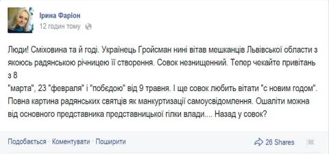 Екс-нардеп Ірина Фаріон дорікнула голові Верховної Ради Володимиру Гройсману, що він привітав мешканців Львівської области з радянською річницею її створення.