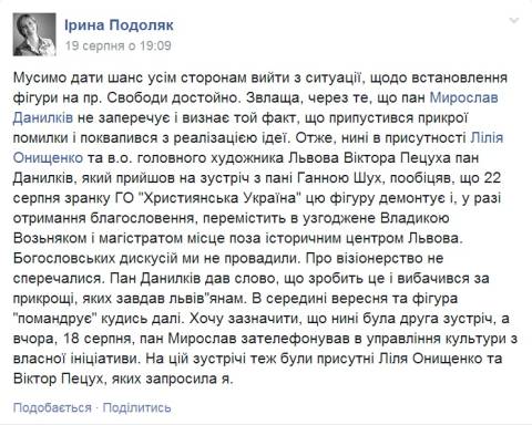 За словами Подоляк, голова ГО "Християнська Україна" Мирослав Данилків пообіцяв, що зранку 22 серпня організація демонтує фігуру і, у разі отримання благословення, перемістить в узгоджене Владикою Возьняком і магістратом місце поза історичним центром Львова.