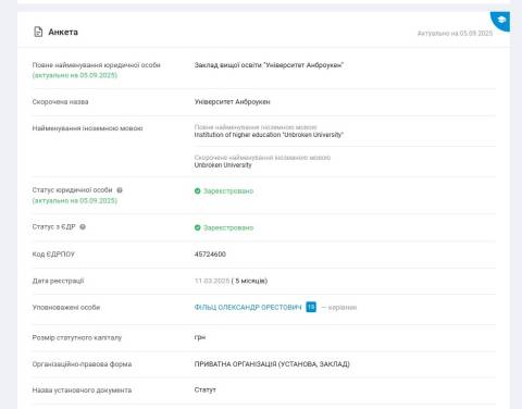 За даними аналітичної системи YouControl, 2 вересня цього року керівником новоствореного львівського вищого навчального закладу "Університет Анброукен" (University Unbroken) став Олександр Фільц.