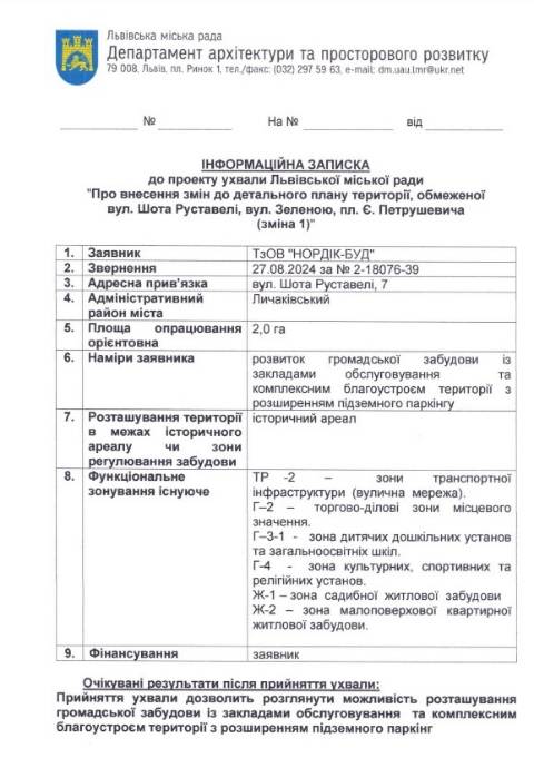 "Планується будівництво офісного центру з паркінгом, з належними елементами доступу на вул. Шота Руставелі, поруч зі спортивною інфраструктурою" – пояснив головний архітектор Львова Антон Коломєйцев.