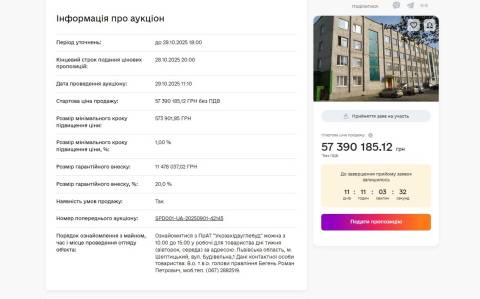 Аукціон стартує 29 жовтня у системі ProZorro, а початкова вартість підприємства становить 57 390 185,12 грн. Вперше підприємство виставили на торги у вересні цього року, однак за ціною у 28 365 644,45 грн. Тоді аукціон не відбувся через відсутність учасників.