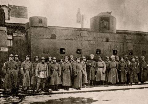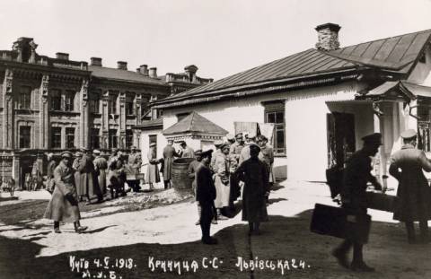 на фото: Казарми січових стрільців на вул. Львівській, 24 в Києві. 4 травня 1918 року.