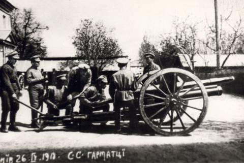 на фото: Гармата батареї Січових стрільців. 76-мм дивізіонна гармата зразка 1902 року російського виробництва. Київ, 26 квітня 1918 року.