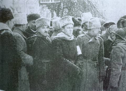 на фото: Симон Петлюра (у центрі), Євген Коновалець (праворуч) та Роман Дашкевич під час проголошення Акту злуки на Софійській площі. Київ, 22 січня 1919 року. Кадр із документальної кінохроніки.